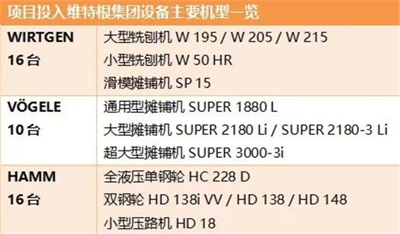 據統(tǒng)計,承建單位全線采用福格勒攤鋪機約 26 臺、悍馬壓路機約 35 臺、維特根銑刨機約 11 臺、SP 15 滑模攤鋪機等共計超過 70 臺維特根集團路面設備。