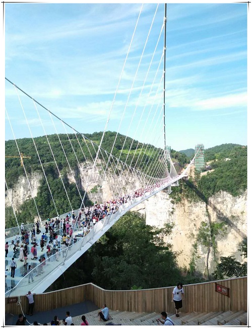 第三站:玻璃橋,橋面距谷底相對(duì)高度約300米,橋長(zhǎng)400多米,橫跨兩座峽谷,是一座全透明的玻璃橋。